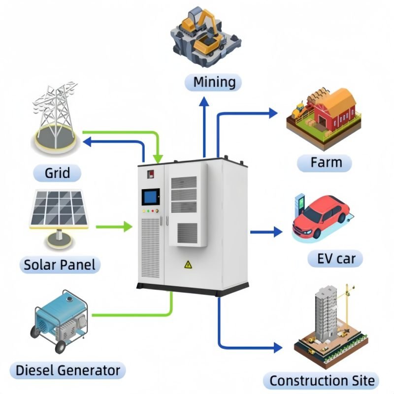 • During charging, the PCS converts AC power from the grid (or renewable sources like solar or wind) into DC power to store in the battery.